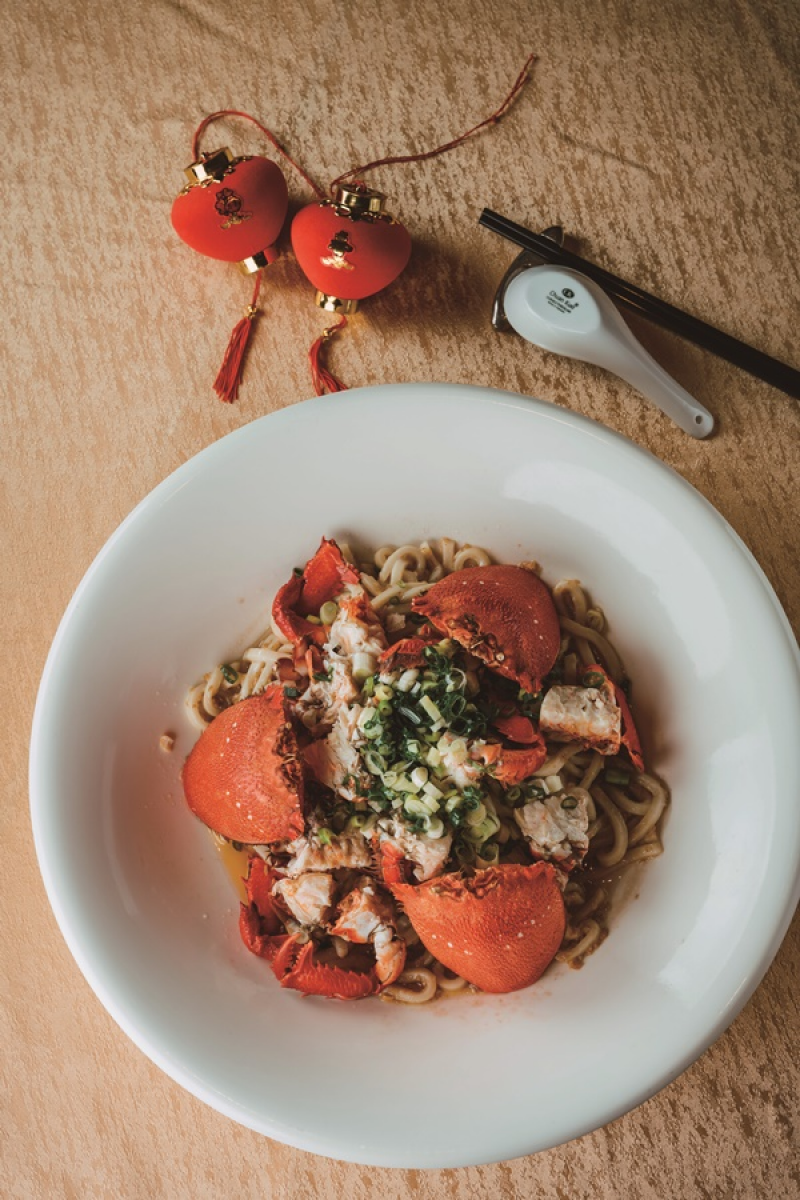 「粉條魚子蒜味蒸旭蟹」,肥美誘人旭蟹用清蒸最能表現蟹肉的鮮嫩原味,加入蒜香的粉條、飛虎魚卵(魚子),味道更香濃,每一口充滿著大海的鮮甜美味。