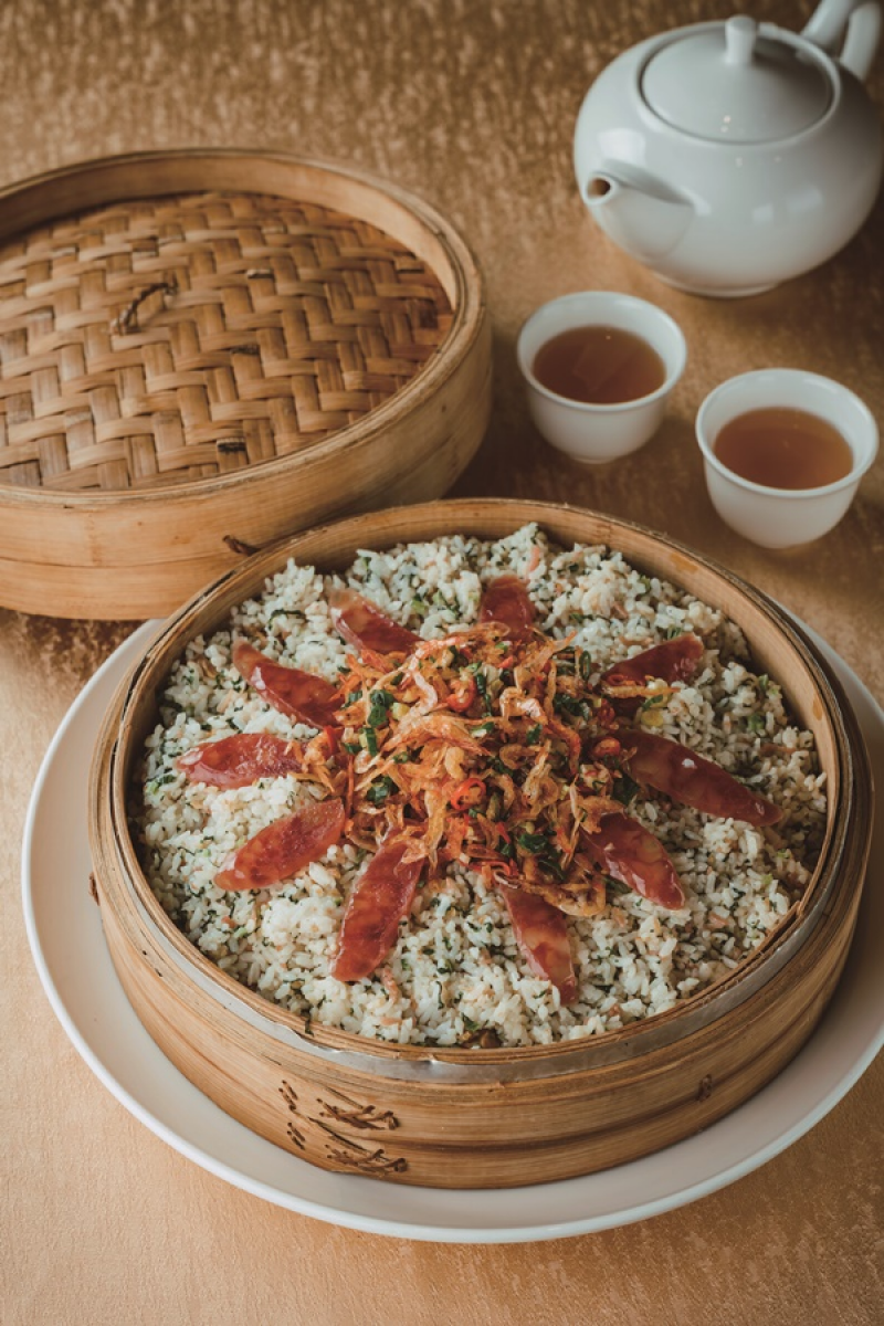 過往菜單內選用油飯居多,今年改變內容,「辣味櫻花蝦圓籠菜飯」以青江菜和雪裡紅加入白米一起蒸煮製成的菜飯,再點綴酥脆櫻花蝦,鹹香的臘腸,更增添味蕾層次。