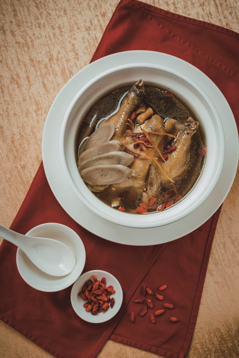 湯品「當歸牛蒡燉童雞」,特選小土雞,加入當歸、牛蒡、蔘鬚、枸杞等藥膳食材,入口湯鮮味美、肉香四溢。這開胃小菜加上九道精緻佳餚,讓大家吃得開心又飽足,主客盡歡,最後送上自製的「精美中西雙點」,「寶島季節水果盤」,完美的收尾。