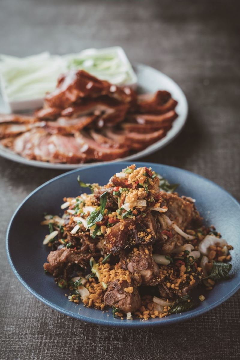 4人暢快享鴨套餐($2,380),片皮鴨有三味吃法,一吃白糖酥胸享口感,源自北京烤鴨的吃法,酥脆胸上黃金8片鴨皮蘸冰晶砂糖,糖粒巧妙平衡鴨皮油脂,口味獨特。二吃半月滑肉搭蘸水,主廚利用當令食材研發的季節蘸水,像夏季推出百香果蘸水,秋季是梅子蘸水,或是沾點特製的花椒鹽,讓鴨肉風味層次更豐富。