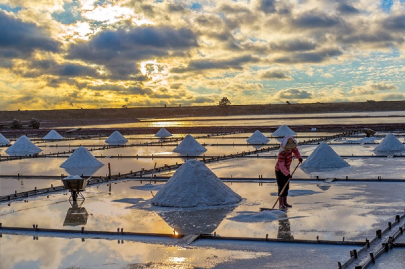 持續運作,全臺最老「北門井仔腳瓦盤鹽田」,日落時分,夕陽閃耀於似雪鹽晶之上,襯著水影反照,映出另一番風情。