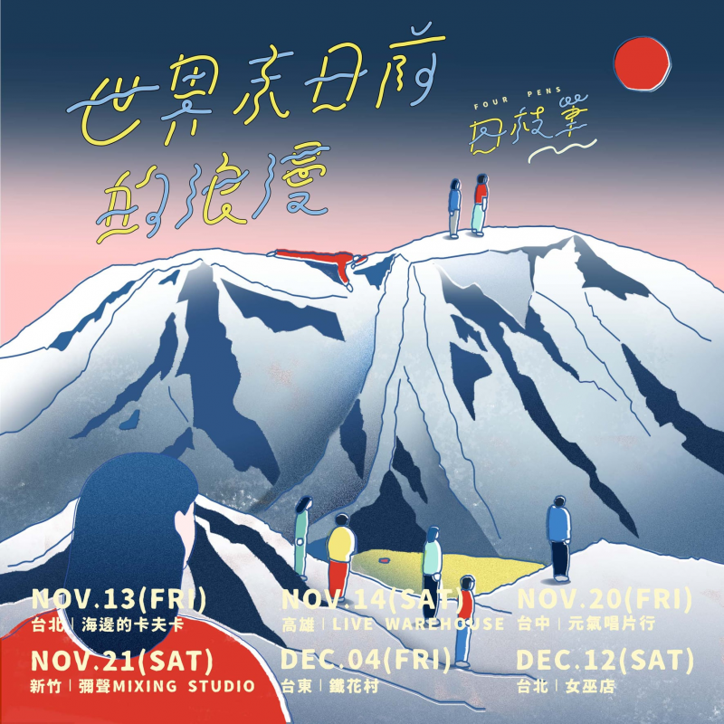 成軍9年的澄癒系民謠樂團「四枝筆」即將在11/13以全新的面貌發行《世界末日前的浪漫》EP以及舉辦全台巡演。「四枝筆」是由主唱小四、鍵盤手咨咨、吉他手Bibo在台藝大吉他社相識而組成。2013年發行2張EP後,即被日本唱片公司「Fastcut Records」相中簽約,至今已受邀至日本巡迴7次,且多次與日本優秀音樂人共同演出合作,例如: 曾我部惠一(Sunny Day Service)、Ann Sally安佐里、市川和則(羊毛與花)、Haruka Nakamura、 Lamp、Miaou、君島大空等等,是少數能在日本音樂市場中唱出自己一片天的台灣獨立樂團。
