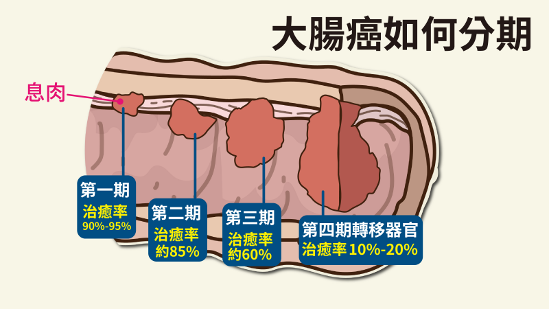 大腸癌是由大腸內的息肉癌化造成,若能早期發現,是較容易治癒的。 癌症存活率從第0期約100%、第一期約90至95%、第2期85%第三期60%到了第4期下降到10%至20%。鄧集能醫師表示,如有大便習慣改變、血便、拉肚子、體重減輕,貧血、大便變細持續2至3禮拜就要注意應及早就診接受進一步的檢查。