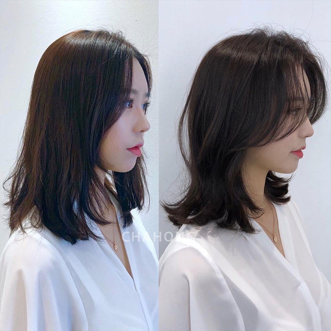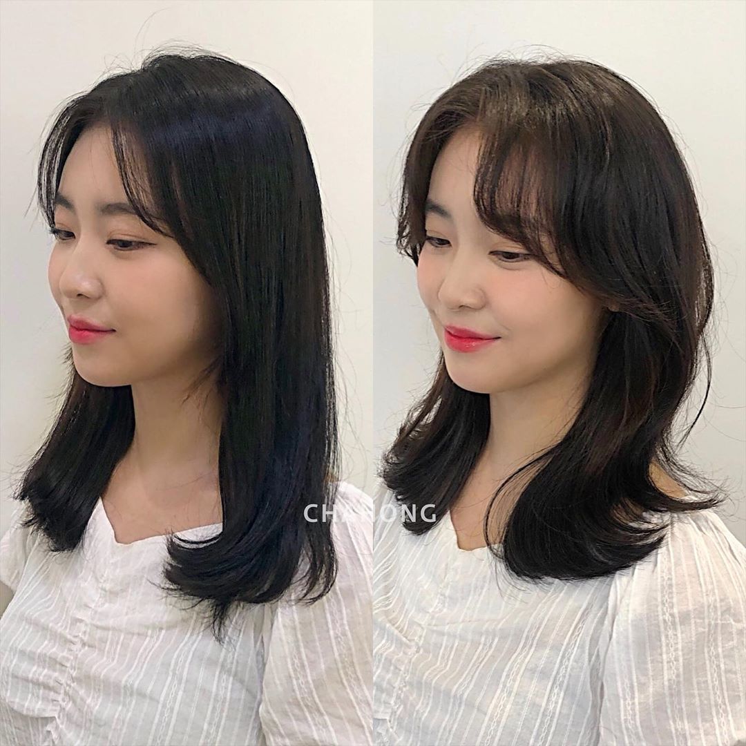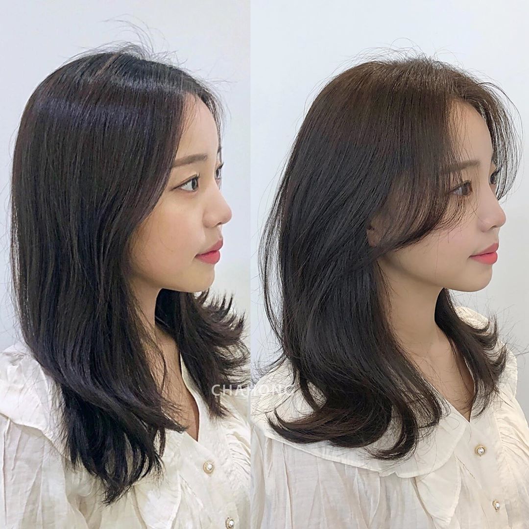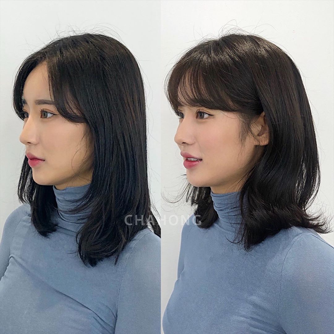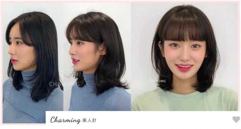 第一個重點即是瀏海的「S型曲線」從髮根一路延伸到顴骨處,不只可以修飾高額頭和凸額頭,從側邊看去還能有效遮住臉龐,就像上圖中的對比照,瀏海稍微改變立馬變身韓系小姐姐的感覺,建議大家可以再把S型曲線瀏海修短至鼻翼高度,露出些許的下顎反而看起來更有V型臉。