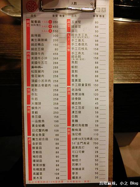 吾陞麻辣單點菜單,鍋底鴨血和豆腐要用加點的,而不是以人頭計費