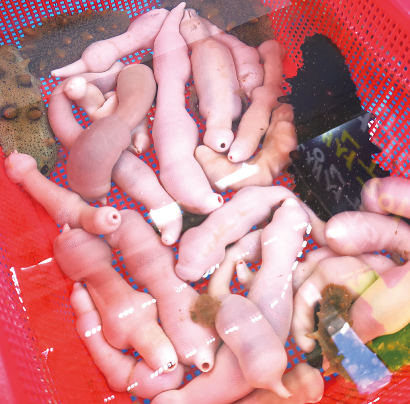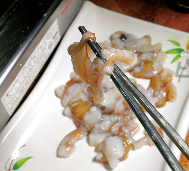 「海腸」外觀圓胖呈長條形,又稱為海蚯蚓,棲息在海邊潮間帶的泥沙中,外表是透紅的乳白色,表面有很多突起,以冬、春兩季最易捕獲。韓國的海鮮餐廳裡,海腸通常是生吃,把頭尾剪開讓血水流出來,將內臟擠壓拉出來,這時候還看到牠在蠕動,之後清洗乾淨、切成小塊食用。因為本身含有甜味物質,只沾芝麻油或略沾辣椒醬吃,就有清甜脆嫩的口感。