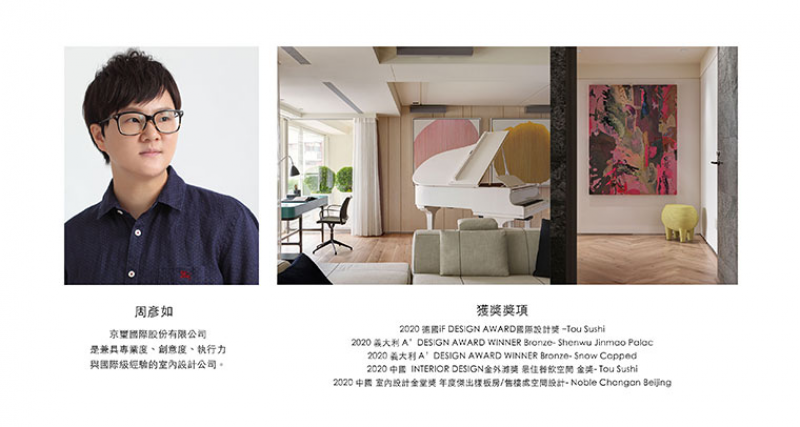 「設計千變萬化,初衷未曾改變」,學廣告出身的周彥如總監投身空間設計後,始終秉持不變的熱情與初心,深入鑽研各面向的生活美學,從軟裝至硬裝、平面至立面,堅信「細節決定成敗」,為人們「訂製品味人生」,將藝術、生活、綠意通過不同形式傳遞於各個角落裡;通過藝術及祟高品鍳能力,引領高品質的生活美學與結構,靜靜品味生活與空間串聯的美好生活節奏。