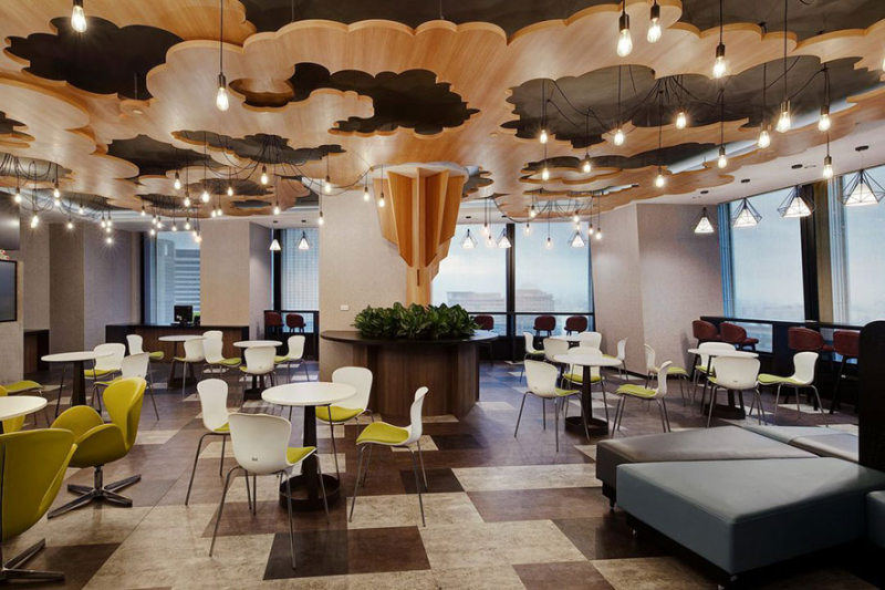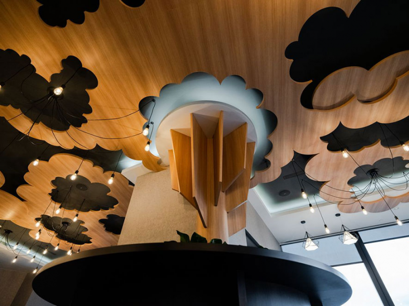 ▲員工餐區轉化直述「綠」的設計手法,以一顆全木質的「主樹」為中心,向上鋪展出雲朵般的高低層序;盞盞看似隨性垂吊的復古燈具,加之四面開窗所透入的溫暖採光,交織出咖啡廳般的放鬆氛圍。
