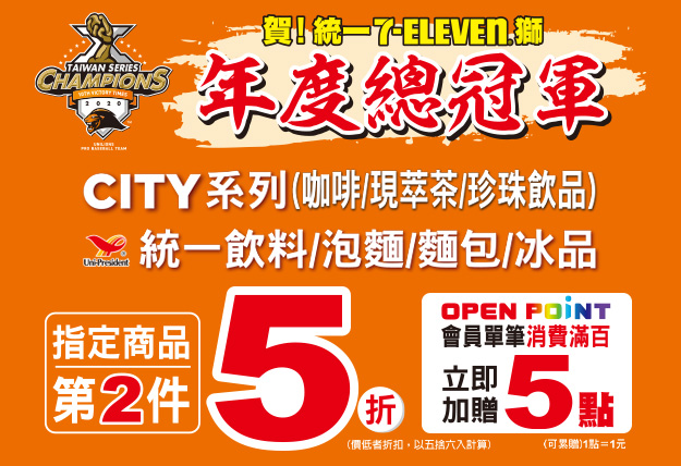 統一獅奪下睽違七年的隊史第十座總冠軍,7-ELEVEn宣布本週末11月20號到22號,限時3天結合實體店面和虛擬APP,推出擴大慶祝活動,除了有實體店面超過400項指定商品,同類別任選第2件5折,APP上的「行動隨時取」 ,更推出咖啡等多項商品限量買10送10。
