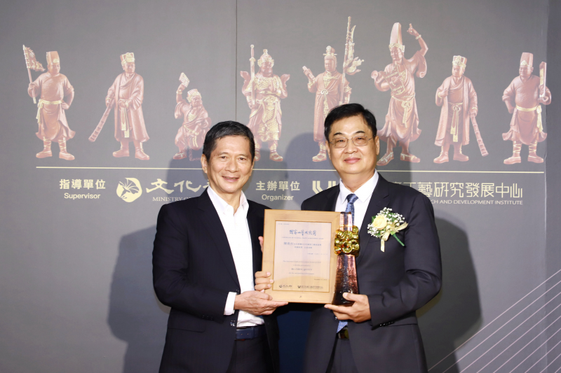 文化部長李永得頒授獎座及得獎證書予第14屆「國家工藝成就獎」木雕工藝師陳啟村先生