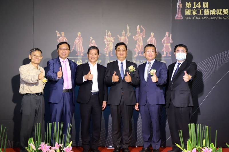 與會貴賓合影。 左起評審委員代表林保堯、工藝中心主任許耿修、文化部長李永得、木雕工藝師陳啟村、立法院副院長蔡其昌、台南市長黃偉哲。