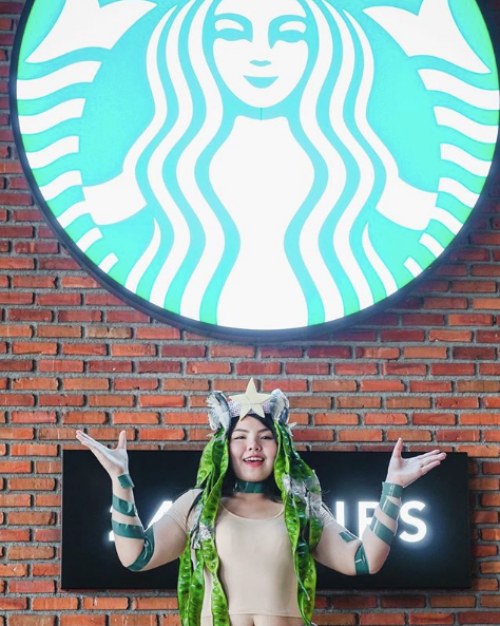 不只是人,連招牌都不放過,星巴克有名的海妖招牌波浪的長捲髮是一段一段的大豌豆接一起(是另類接髮嗎?),旁邊兩條魚尾直接用綠色膠帶貼一貼,最好笑的是頭上星星旁邊黏了一圈魚!