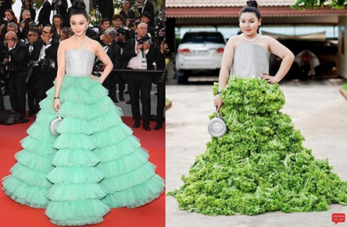 還有這一套連范冰冰出席坎城影展的禮服,他用鐵鍋跟大陸妹就完成激似造型,而且是連冰冰自己都轉發認可!