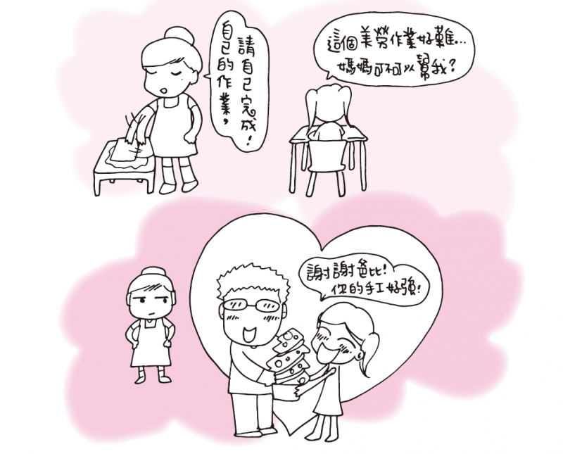 有人能擔任孩子「討救兵」時的角色,代表他願意分擔我們照顧孩子的責任,可以讓忙碌的主婦偶爾離開孩子喘口氣,找回自己原本的生活步調,與其去看缺點,不如正向思考,隨時謝謝身邊的另一半、長輩、親友願意陪伴孩子、讓寶貝有更多的愛圍繞。