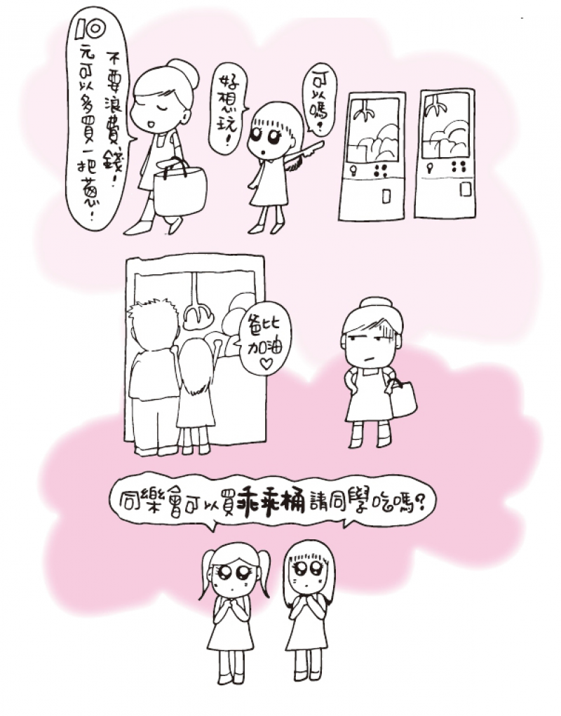 不要主動買東西給小孩、太輕易給予孩子零用錢,避免養成孩子的物欲與價值的偏差,惜物惜福、要有付出才能有收穫,否則會不懂珍惜。
