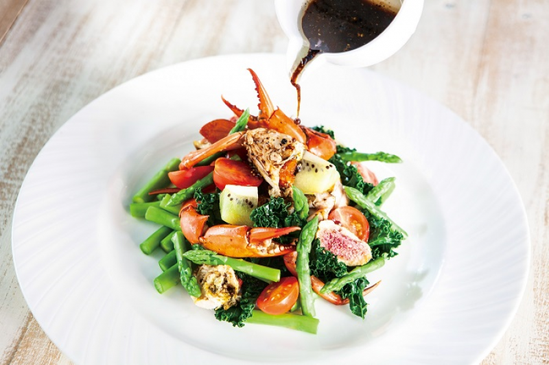 食材:螃蟹1隻、無花果1顆、蘆筍1把、小蕃茄6個、綠色奇異果1個、羽衣甘藍適量