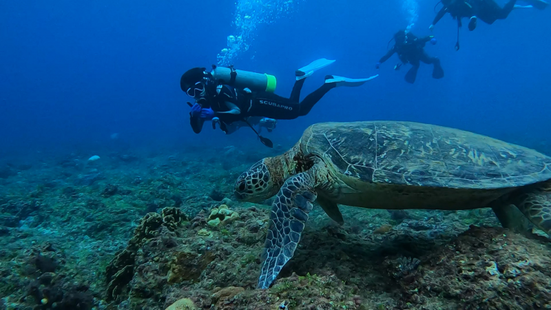 他自己曾在水中被數以千計的銀色梭魚包圍成「銀龍捲」,「就像身在龍捲風中一樣,美呆了!」也曾看到潛水界盛傳的150歲「神龜」從他身邊緩緩游過,「他超級巨大,跟身高175公分的我一樣高。」據說「神龜」很少出現,能遇到就像中頭獎,大Q秉洛覺得自己很幸運,「看到它,就感覺東海龍宮不遠了!」教練虧他應該是很單純、動物靈性高所致,「教練們為了看海中奇景。所以特愛跟我一起『下海』!」