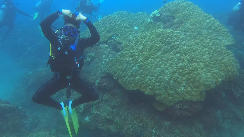 他大多在墾丁、小琉球海域練習,被水底的美景迷住,越來越愛上潛水!也意外發現自己的「特異功能」,原來不是每個潛水者都有機會看見特殊的美景和生物。「據說海洋生物有比人還強的直覺,可以分辨一個人的好壞,基於生物本能,遇到善良的潛水客就會親近,若遇到氣場不太單純的人,動物一溜煙就游走。」