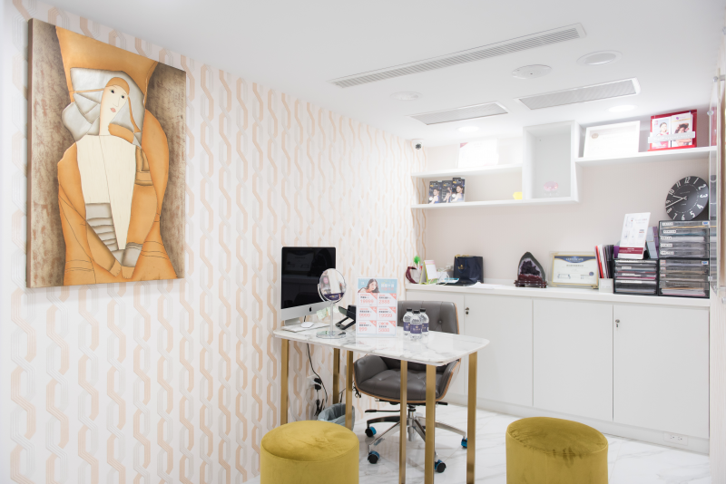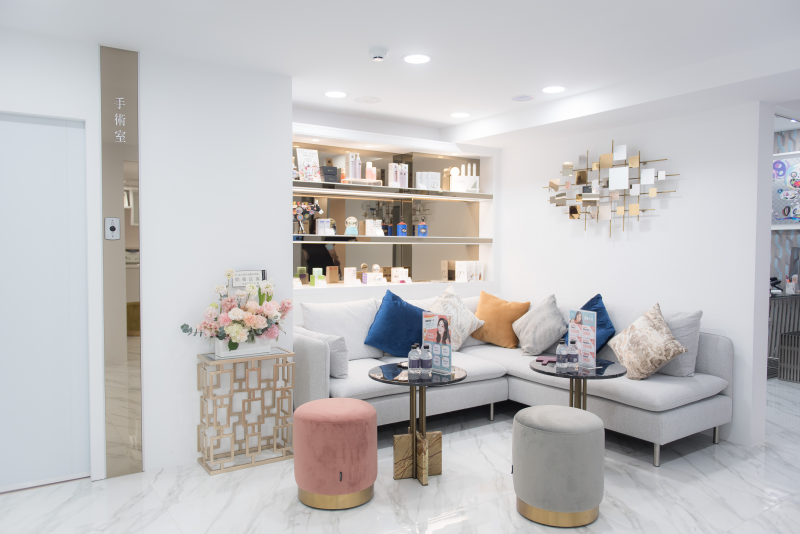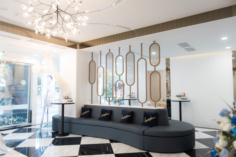 全新台中分院打破有別以往的店內風格,以現代輕鬆、又帶點古典雅緻的氛圍營造如藝廊般的美學場域。店內共有2層樓,1樓全區以大理石牆面、棋盤格地磚為設計風格,以白、藍色為主要色調,綴以造型水晶燈飾、鏡面元素、知名藝術家畫作、雕塑等不定期藝術展示,讓人可以感受到這個場域流露出的濃厚藝術氣息。此外,2樓的交流區,也以金色、粉色系桌椅擺飾,無壓迫感的設計讓人有種到咖啡廳的愜意感。希望賓客在此除了解決於美的疑難雜症外,亦可以毫無壓力的於空間中欣賞藝術,於內於外都在此提升,奠定內外美學雙贏概念。