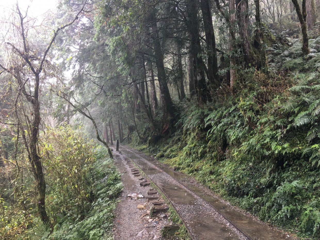 這天我們走到見晴古道時,雨不算太大,但是因為已經連下好幾天的雨,古道跟鐵軌路面都有許多積水,有的路段路面比較大,但有的路段很靠近山崖,加上鐵軌容易溼滑,行走時要特別小心,行走時最好選擇靠中間或是山壁這側會比較安全。
