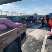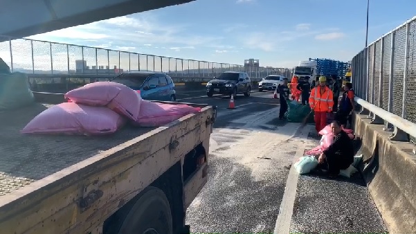 今日上午7時許,國道一號北向銜接彰化系統通往國道三號匝道處,一台滿載白米的貨車,疑似沒有綑綁牢固,加上彎道離心力大,導致後車斗的白米翻落,匝道上一片雪白,適逢上班尖峰時間,也造成近7公里的回堵,目前相關單位正在事故排除中。