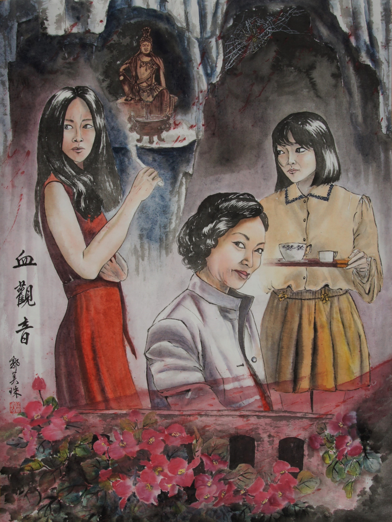 要創造一幅名符其實的《血觀音》水墨畫,實不容易!觀音佛像是我平日膜拜的神,要畫出祂的斷手,讓我很揪心!但觀音佛像是《血觀音》重要的珍品,所以畫中不能沒有祂。為了這尊觀音佛像,我的心是糾結、不捨的。最終畫出斷手的觀音菩薩,我只能向您說聲:「對不起!」