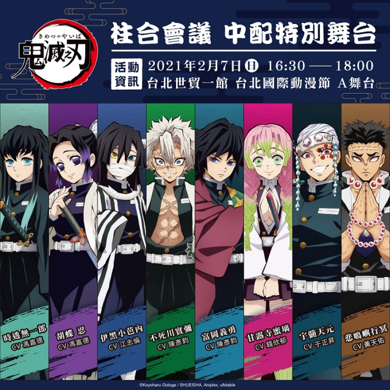 「木棉花」在台北動漫節,將舉辦只屬於入場粉絲與觀眾才能獨享的「柱合會議」!邀請到的專業配音群包括「水柱‧富岡義勇、風柱‧不死川實彌」的配音老師陳彥鈞、為「蛇柱‧伊黑小芭內」配音的江志倫、「戀柱‧甘露寺蜜璃」配音員錢欣郁等重量級陣容,更令人感動的還有首度蒞臨現場的「蟲柱‧胡蝶忍、霞柱‧時透無一郎」的配音老師馮嘉德、「音柱‧宇髄天元」配音員于正昇、「岩柱‧悲鳴嶼行冥」配音員黃天佑等3位老師,將以鬼殺隊菁英的身份,在「台北國際動漫節」舞台和全台鬼滅粉們共度歡樂時光!