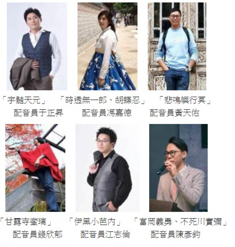 首度從配音室現身的重磅級中文配音陣容中,于老師曾擔任《蠟筆小新》的「野原廣志」,馮老師則飾演過小朋友最喜歡的《可愛巧虎島》「巧虎」,黃老師則配音過經典動畫《烏龍派出所》的「中川圭一」,而再次登場的陳老師、江老師、錢老師演出的角色和主人公們也有很大的反差,在舞台上會有甚麼樣的火花,令人非常期待!入場的粉絲也將獲得僅限本活動才能擁有的「《鬼滅之刃》九柱限量珍藏簽名板」