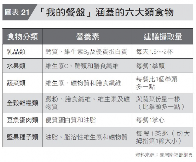 (編按:臺灣衛福部於二○一九年推出了「我的餐盤」飲食指南,涵蓋六大營養類,並詳盡說明了每類食物含有的營養素及每日建議攝取量,見本頁圖表21。)