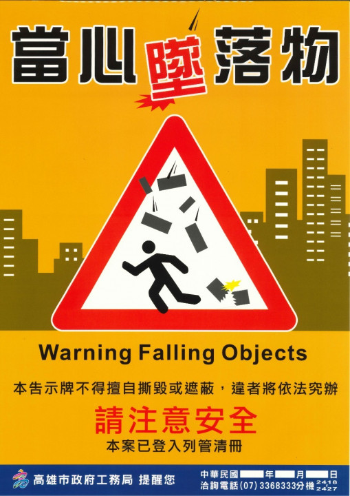 工務局呼籲,近日因溫差較大,請民眾於經過建築物時應於騎樓內行走,以避免外牆飾材剝落造成意外發生。民眾若發現建築物外牆有剝落或隆起的情形,應儘速撥打1999向市府舉報,經工務局確認有影響公共安全者,將於現場張貼「當心墜落物告示」並要求該建築物所有權人、使用人依建築法規定改善,如未改善,則依同法處以新臺幣六萬元以上三十萬元以下罰鍰。