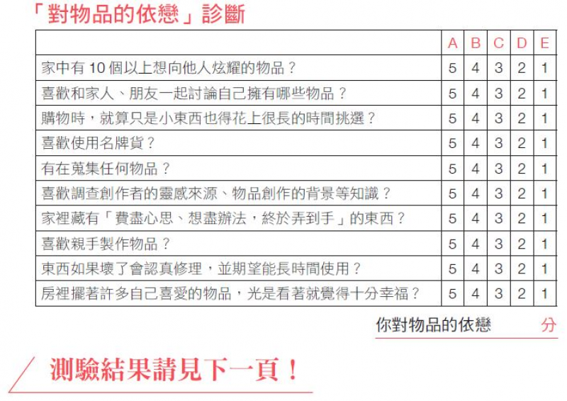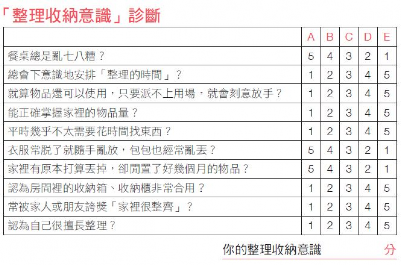 現在就透過「整理收納意識」與「對物品的依戀」,分析自己的整理類型吧。請針對下列各問題,圈出符合你個人情況的項目;接著請把圈出的分數加總,分別得出兩種診斷的總分。
