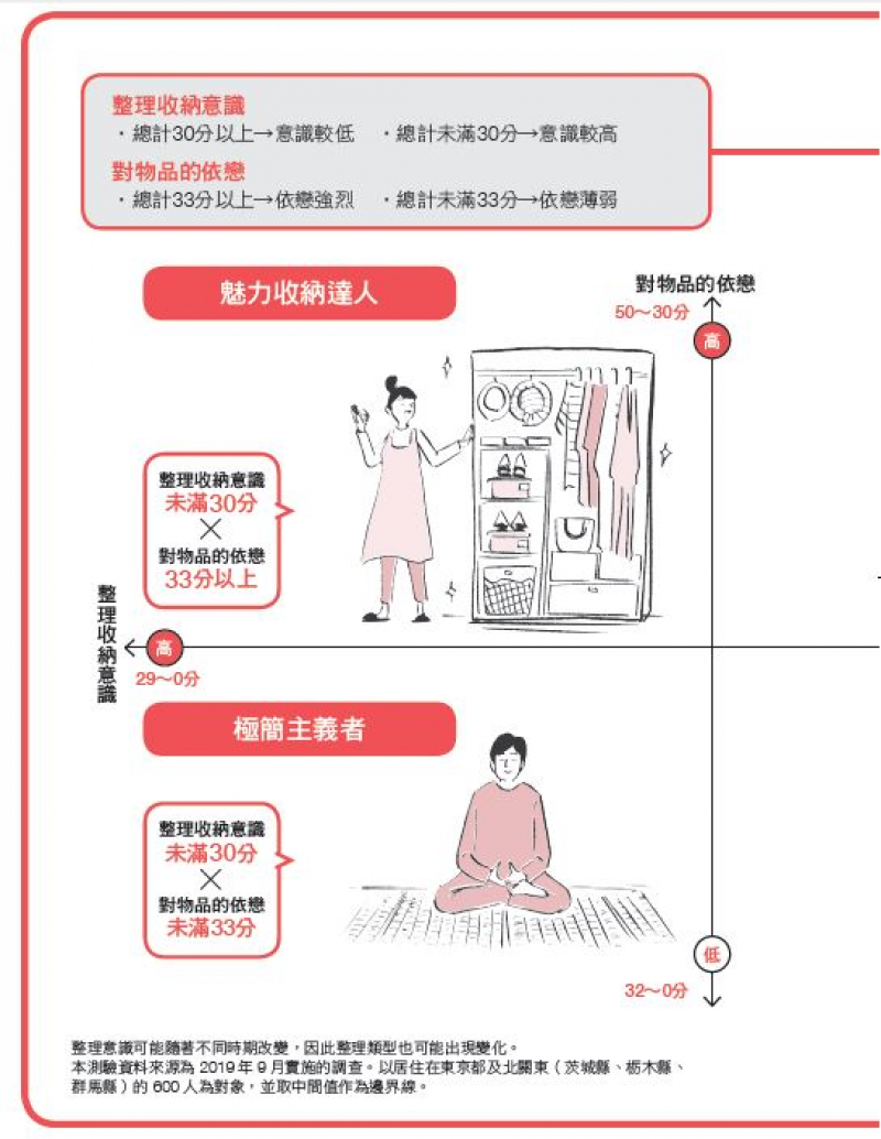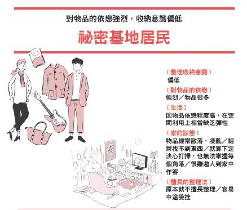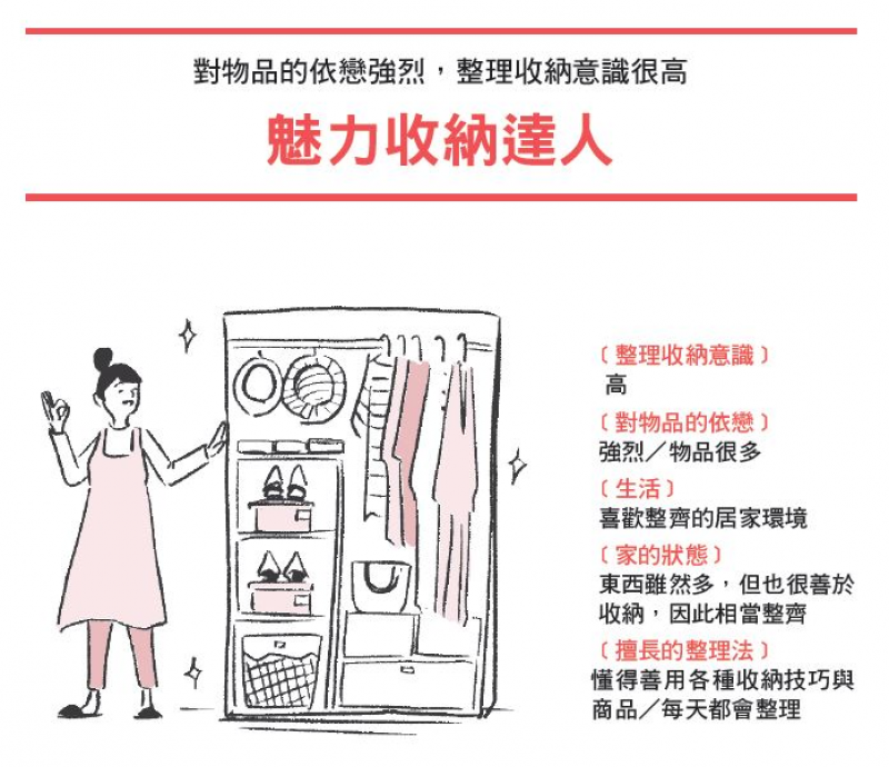魅力收納達人對物品的依戀程度很高,對於心愛的物品也很難放手;與祕密基地居民不同的是,他們希望擁有整齊的居家環境,因此每天都會專注於整理工作。這類型的人可說是近年來收納術風潮的領導者。