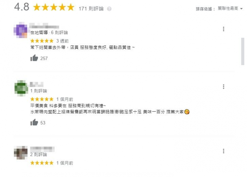 ▲辱罵外送員鴨肉店一夕刪光3千則負評,以4.8顆星好評強勢回歸。(翻攝自 Google)