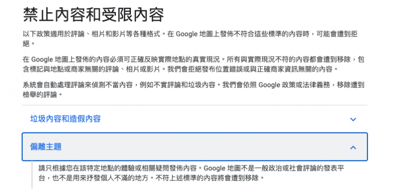 Google的評價機制上也寫著Google 地圖不是一般政治或社會評論的發表平台,也不是用來抒發個人不滿的地方。不符上述標準的內容將會遭到移除。