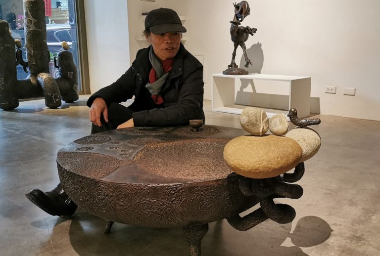 【記者葉志雲/台中報導】鐵雕藝術家王忠龍2021新年伊始應邀在台中市臻品藝術中心舉行『鐵石心藏』金工創作個展,1月9日下午3點開幕式,展出改造廢五金結合石頭的30件鐵雕創作,他把焊條當畫筆,將冰冷的鐵和石頭幻化成溫暖的藝術品,每一件都蘊含作者感人的溫馨故事,展期至2月27日。