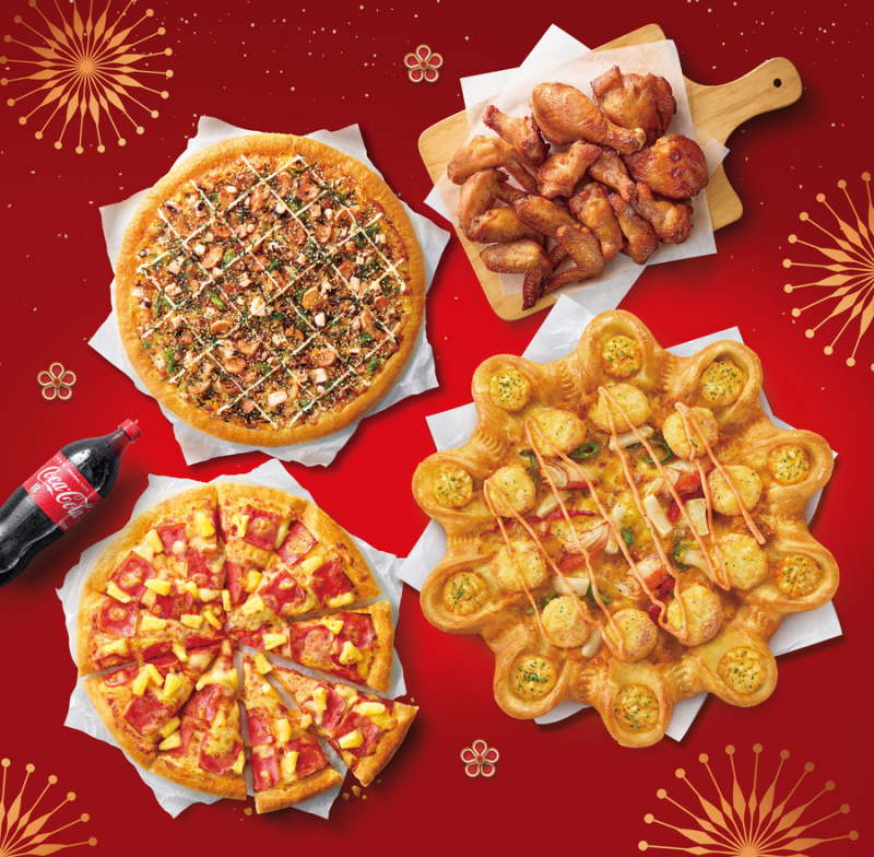 - 一訂開運團圓餐1,199元:大比薩綁定3珍海味團圓口味搭配香濃起司洋芋餅皮+外帶大比薩(限定710元以下口味)/外送小比薩(限定460元以下口味)+HOT燒大拼盤或雙麵大四喜+1.25L可樂2瓶