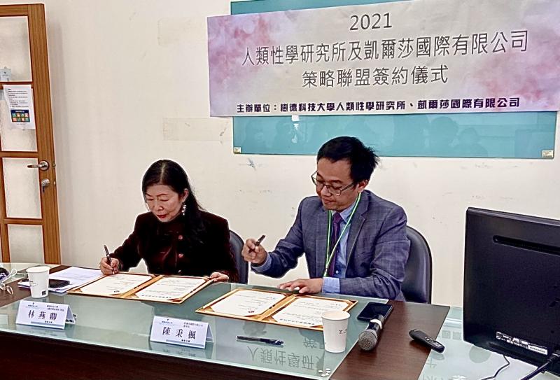 副圖:樹德科大人類性學研究所林燕卿所長(左)與凱爾莎國際公司陳秉楓董事長(右)正式為產學聯盟簽約合作