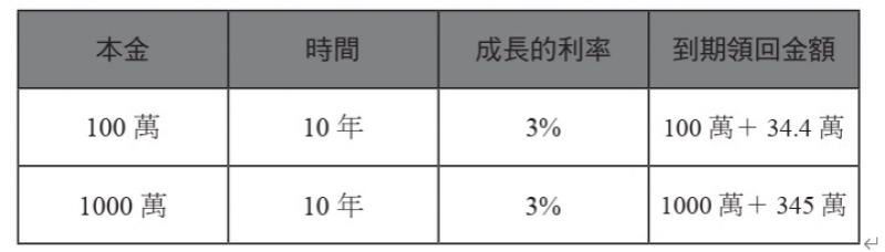 的人可領回1,000 萬元的本金加上345 萬元的增值收入。345 萬元的增值收入絕對遠大於34.4 萬元,可見在相同的投資時間,以同樣的利率增長,投入的本金越大,增值收入的絕對值越大。想辦法讓自己的本金透過存錢、薪資增長、減少支出,來持續的累積。本金累積得越大,累積報酬絕對值的速度就越快!