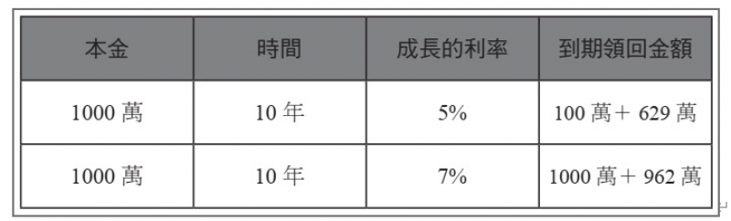 兩人各自投入1,000 萬元,並各以每年5% 及7% 的利率成長,每年的成長再投入下一年累積,兩人各自累積10 年,10 年後以每年5%利率成長的人可領回1,000 萬元的本金,加上629 萬元的增值收入;而每年以7% 利率成長的人可領回1,000 萬元的本金,加上962 萬元的增值收入。能持續以7%增長的人,10年幾乎可以翻倍成長,而持續以5% 增長的人,10 年持續成長也不過是原來本金的1.5 倍。