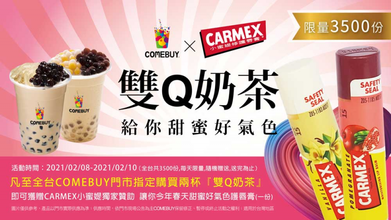 今年的春天將特別幸福,知名連鎖飲料店「COMEBUY」將攜手國際品牌「CARMEX小蜜媞」護唇膏,一起推出【雙Q奶茶 - 給你甜蜜好氣色】獨家聯名活動。新春第一檔COMEBUY隆重推薦超級明星商品「雙Q奶茶」,晶瑩剔透的珍珠;任你搭配選擇小芋圓或Q彈粉條,與自己的好友或情人一起飲用,真的幸福剛剛好。凡於活動期間2021年02月08日至2021年02月10日,現場營業門市,指定購買兩杯大杯「雙Q奶茶」就免費贈送「CARMEX小蜜媞護脣膏」一支(市售129元),全台共3500支,數量有限,隨機送完為止,讓你擁有整年甜蜜好氣色!