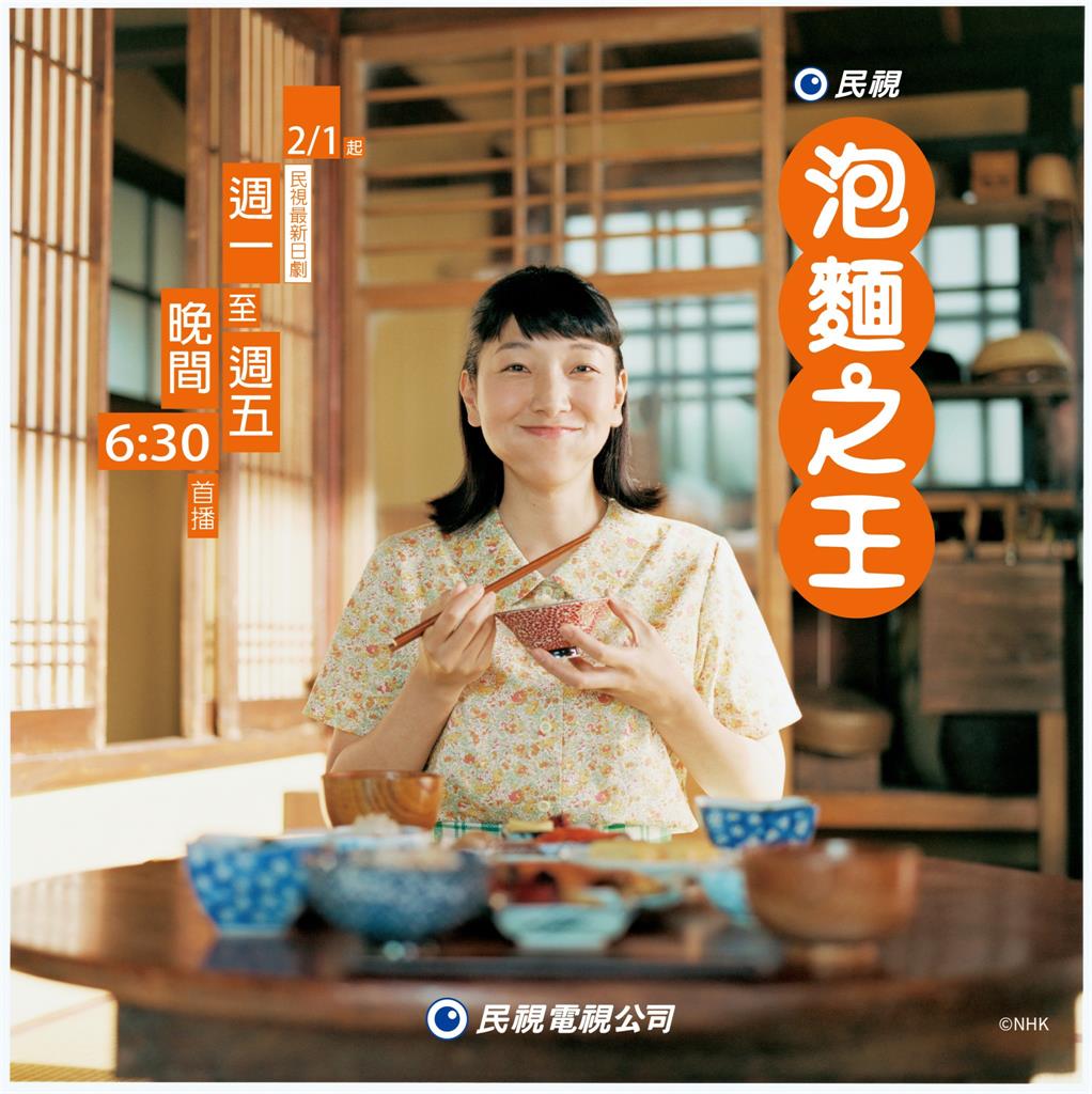 備受矚目的是民視這次2/1起,每週一到週五晚間6點30分播日本NHK戲劇《泡麵之王》,劇情以日清食品創辦人「安藤百福」與其妻「安藤仁子」為原型。由演員安藤櫻飾演主角今井福子,以及長谷川博己飾演的丈夫立花萬平,這是講述一對平凡夫妻發明了泡麵,成為現在民生不可或缺的必需品,在誕生的背後有著不為人知的故事。