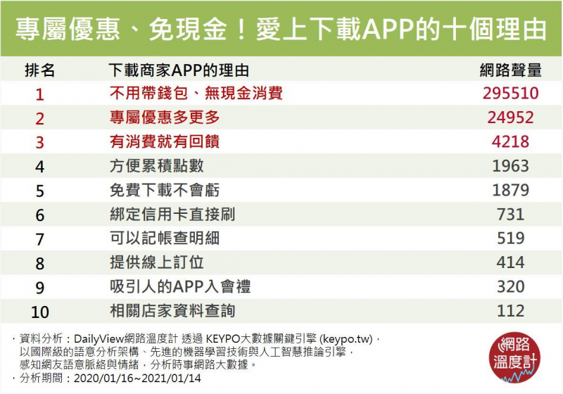 除了消費者結帳方式改變,花樣越來越多的App更是讓人下載不完,許多店家提供線上訂位、App專屬優惠、App儲值結帳等模式,你知道哪一種功能最打中消費者的心嗎?今天《DailyView網路溫度計》就透過《KEYPO大數據關鍵引擎》調查消費者願意下載店家App的10個理由,第一名果然不負眾望!
