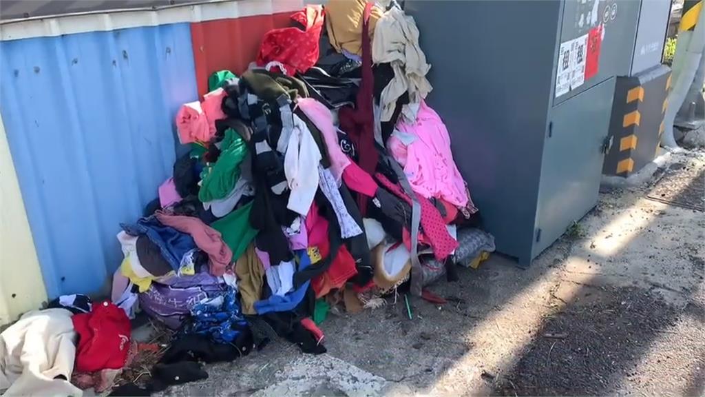 推開舊衣回收箱,各式各樣的衣服滿出來,誇張的是,往旁邊一看,竟然還有一座衣服山,連回收箱後面也不放過,到處都是雜七雜八的舊物,民眾扔了就拍拍屁股走人。