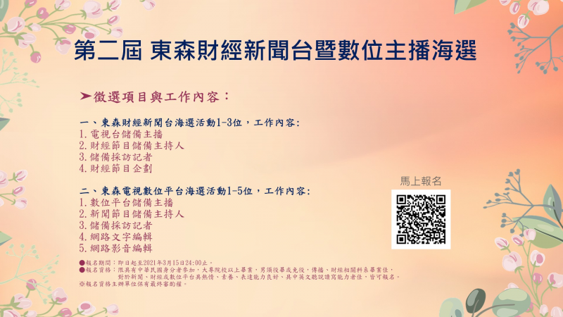 在首屆成功落幕後,今年東森電視將再度舉辦第二屆東森電視主播海選活動!不論是新聞主播、節目主持人、記者到節目企劃等等,只要你/妳對新聞媒體產業、財經或數位平台有興趣、有夢想,你/妳就是我們要找的人!