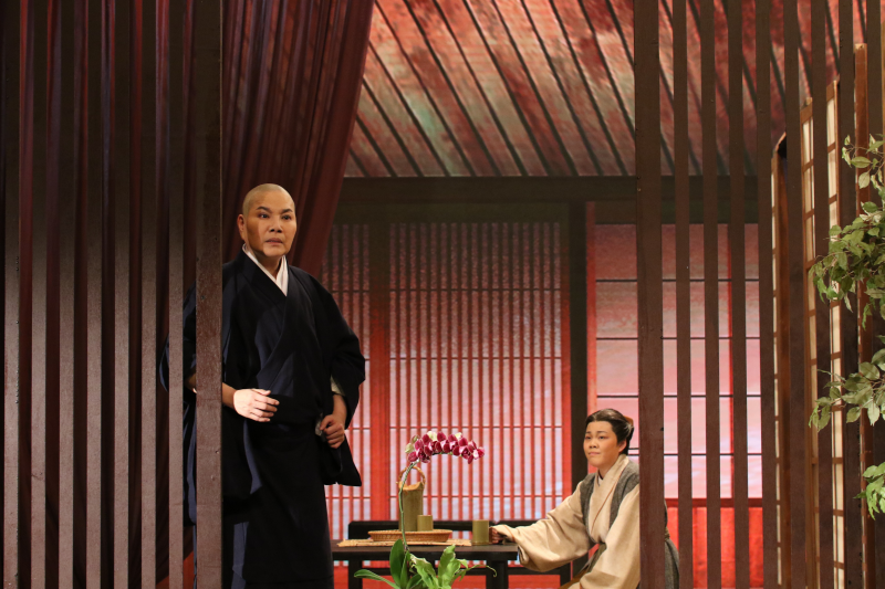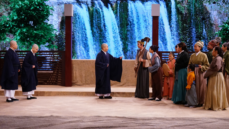 從外景拉回棚內拍攝也煞費苦心,高僧傳一般是「單面舞臺」,也就是背影是LED螢幕,演員面對攝影機走位。拍攝<�行基菩薩>為了戲的連貫性,特別搭建了一個房子,以「三面舞臺」的方式在鏡頭前呈現空間感,從庭院到大廳到房間,一進一出來回走動,考驗導演一鏡到底的能力。