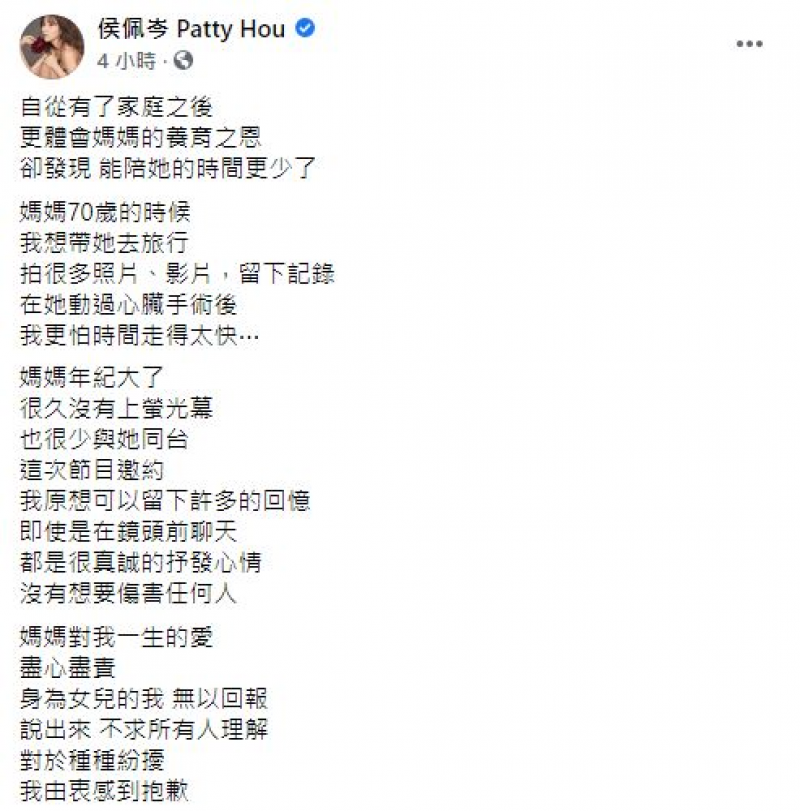 ▲侯佩岑發文「沒有想要傷害任何人」,向造成傷害的人道歉。(圖/翻攝自侯佩岑臉書)