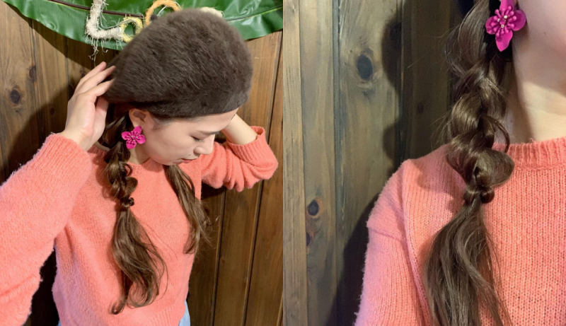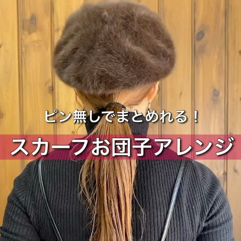 首先紮出一個低馬尾,且戴好貝雷帽,接著將絲巾串上馬尾上的髮圈,並以雙股辮的方式纏繞在一起,最後再將辮子繞成包頭,用絲巾打一個蝴蝶結固定即可完成,造型簡單快速卻又充滿細節感!不過在絲巾的挑選上建議選擇軟質料、長度長的款式會更好上手喔!