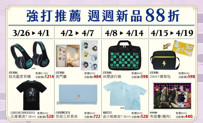 除了福袋之外,更有期間限定新品88折,其中推薦首週3月26日至4月1日特價的《鬼滅之刃》耳罩式炫光藍牙耳機,高質感設計耳機視覺與聽覺同時享受,及4月15日至4月19日《JOJO的奇妙冒險》橫向布掛畫,精美圖面絕對是JOJO粉絲必蒐藏的品項!