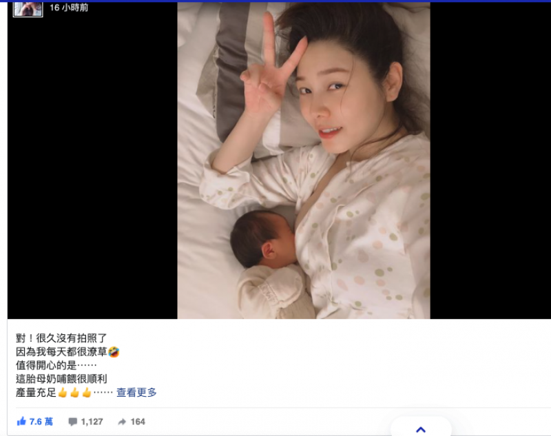 藝人白家綺7日生下女兒小朵拉,升格為四寶媽咪,昨(15)日她在臉書曬出哺乳照片,表示這一胎的母奶哺餵很順利,產量充足,「小朵拉每天都好滿足」。素顏入鏡的她看起來氣色相當不錯,吸引大批粉絲留言祝福。