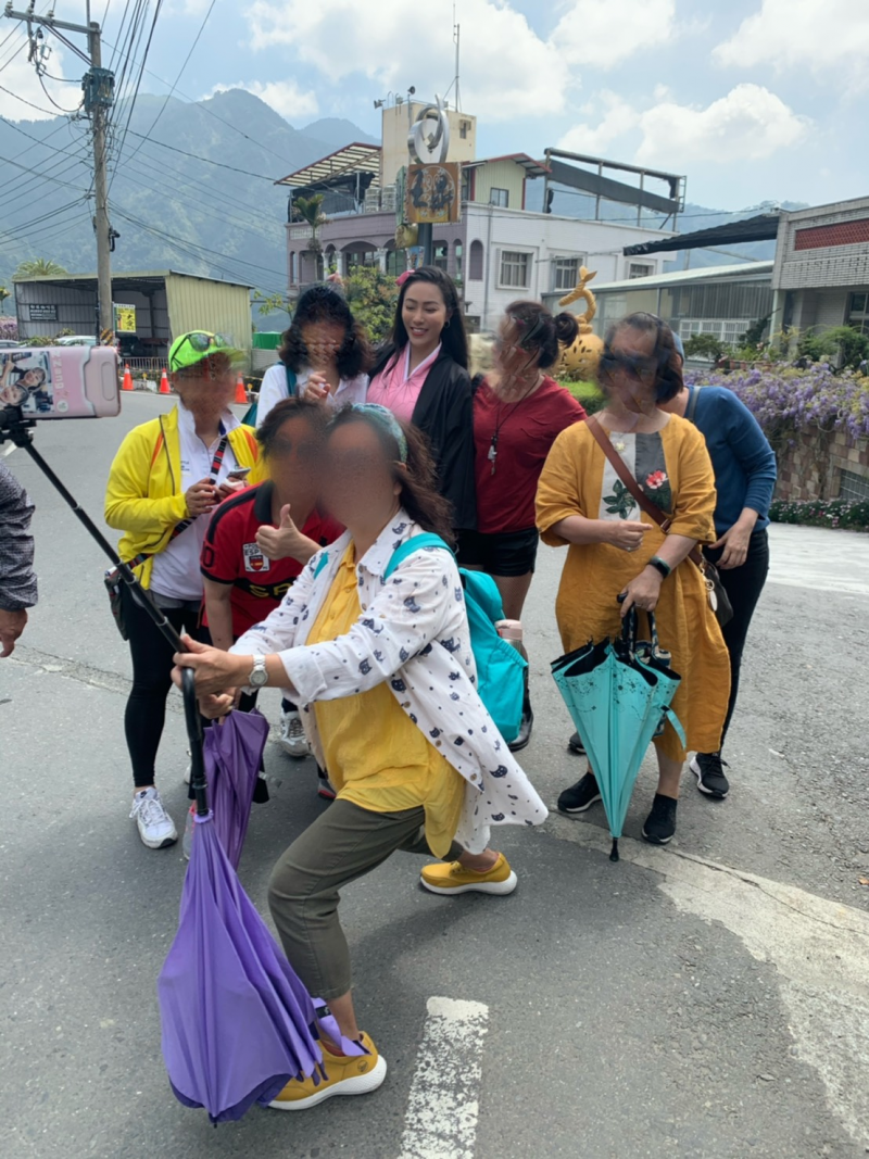 昨在進行直播的途中,邦妮與翁章梁縣長邊走邊聊,巧遇前來朝聖紫藤花季的大媽軍團,還一擁而上跟邦妮拿著自拍棒合照,七嘴八舌稱讚她漂亮可愛,直播一度被中斷,也把縣長團團包圍求合照,翁縣長苦笑吶喊:「我們還在工作啊~」現場笑成一團。後來一行人不放棄,還要繼續跟著縣長和邦妮一起走行程,被工作人員婉拒,讓邦妮直呼:「嘉義人也太熱情了吧!」